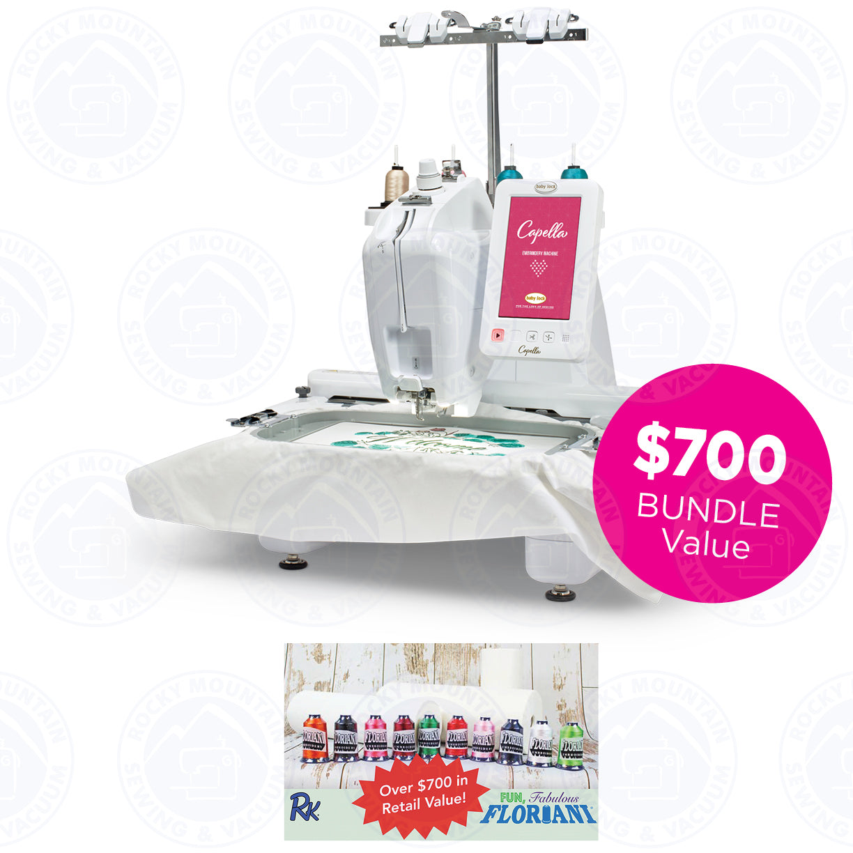 Elevate your embroidery business with the Baby Lock Capella. This single-needle, free-arm machine boasts precision with its crosshair positioning laser, making design placement a breeze. Its ample 7-7/8" x 11-3/4" embroidery field accommodates diverse and large projects, and the freearm makes it easy to embroider hats, sleeves and other hard-to-reach areas. The TruView LCD touchscreen showcases over 260,000 vibrant colors for design perfection. Enjoy convenience with a built-in bobbin winder, automatic needle threader, and 38 editable fonts. With 175 built-in designs and 38 editable fonts, enjoy endless creative possibilities. Transform your embroidery with the Capella today!