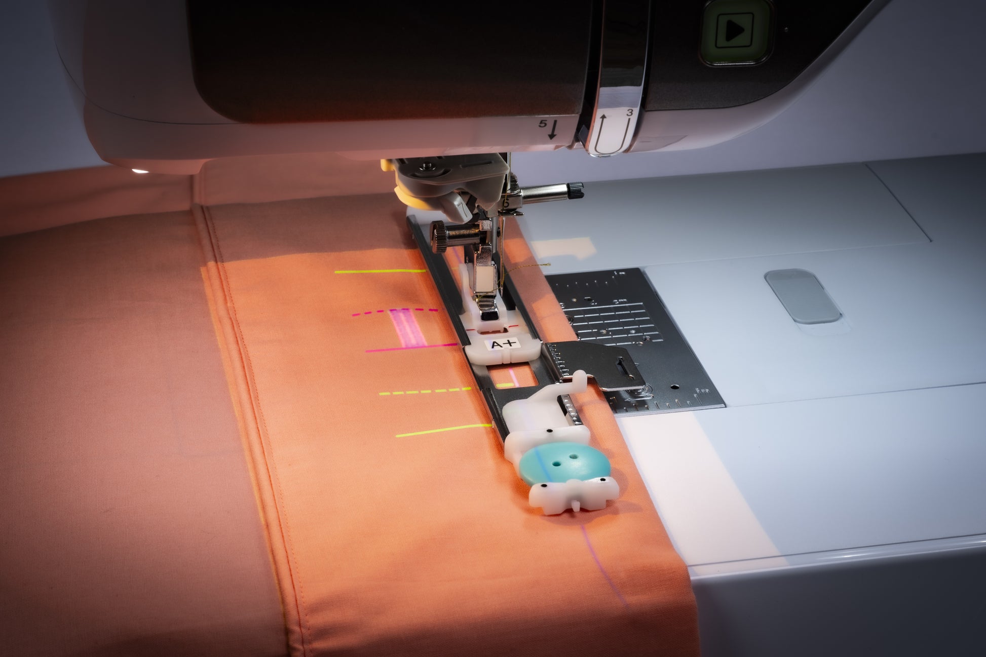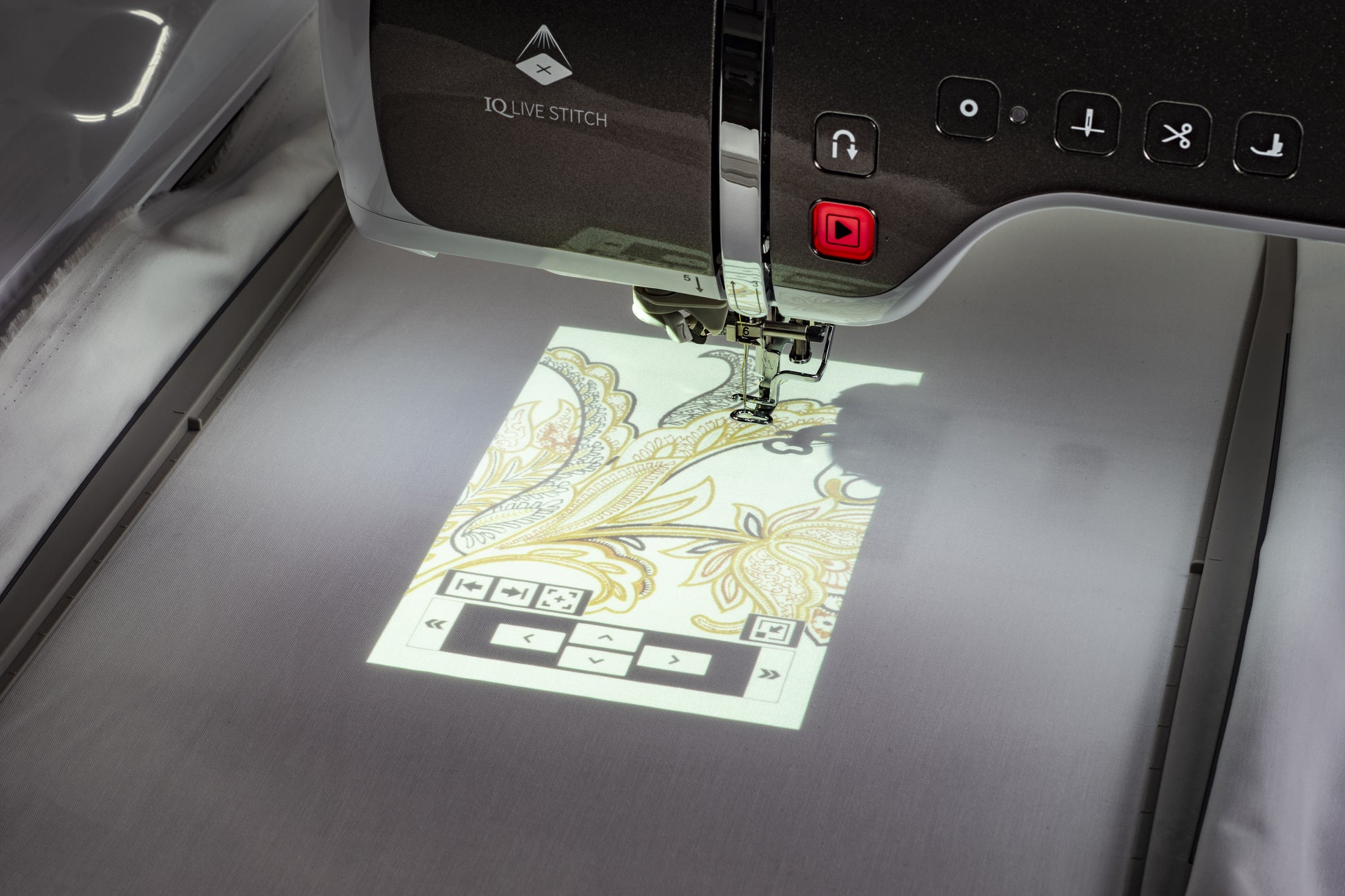 With the IQ Live Stitch Projector, preview the style, placement (vertical or horizontal), and spacing of your buttonhole before stitching.